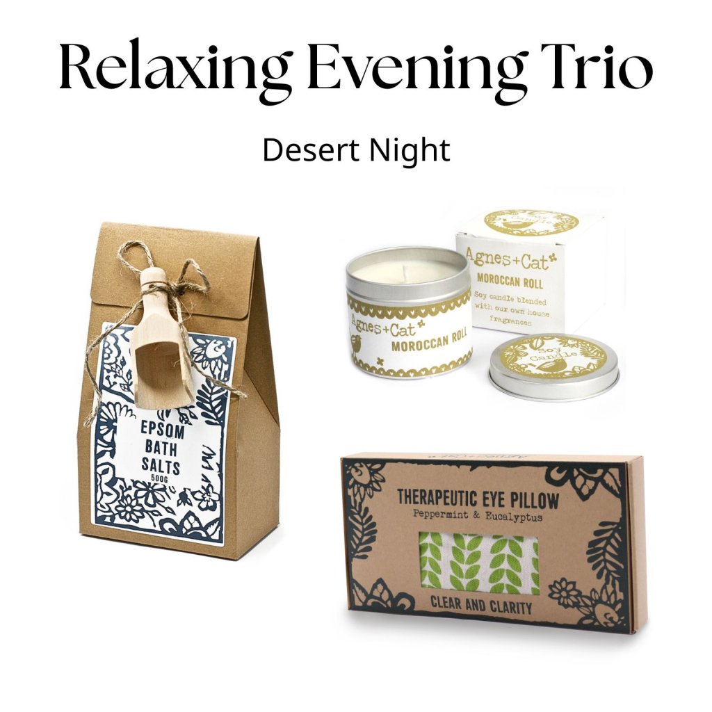 🌙 Desert Night: Epsomská koupelová sůl (bez vůně) + Moroccan Roll svíčka + Clear & Clarity polštářek: Čistý dech a klid v hlavě – eukalyptus, máta a jemně kořeněná svíčka navodí pocit vnitřní rovnováhy.